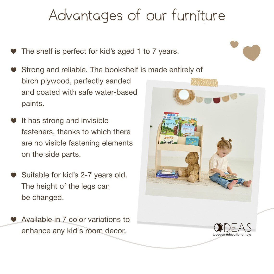 Conçu selon la méthode Montessori, ce mobilier est adapté aux enfants de 2 à 7 ans. Il leur donne accès à des livres et des jouets et les encourage à jouer et à lire. Il favorise l'autonomie et le sens des responsabilités.