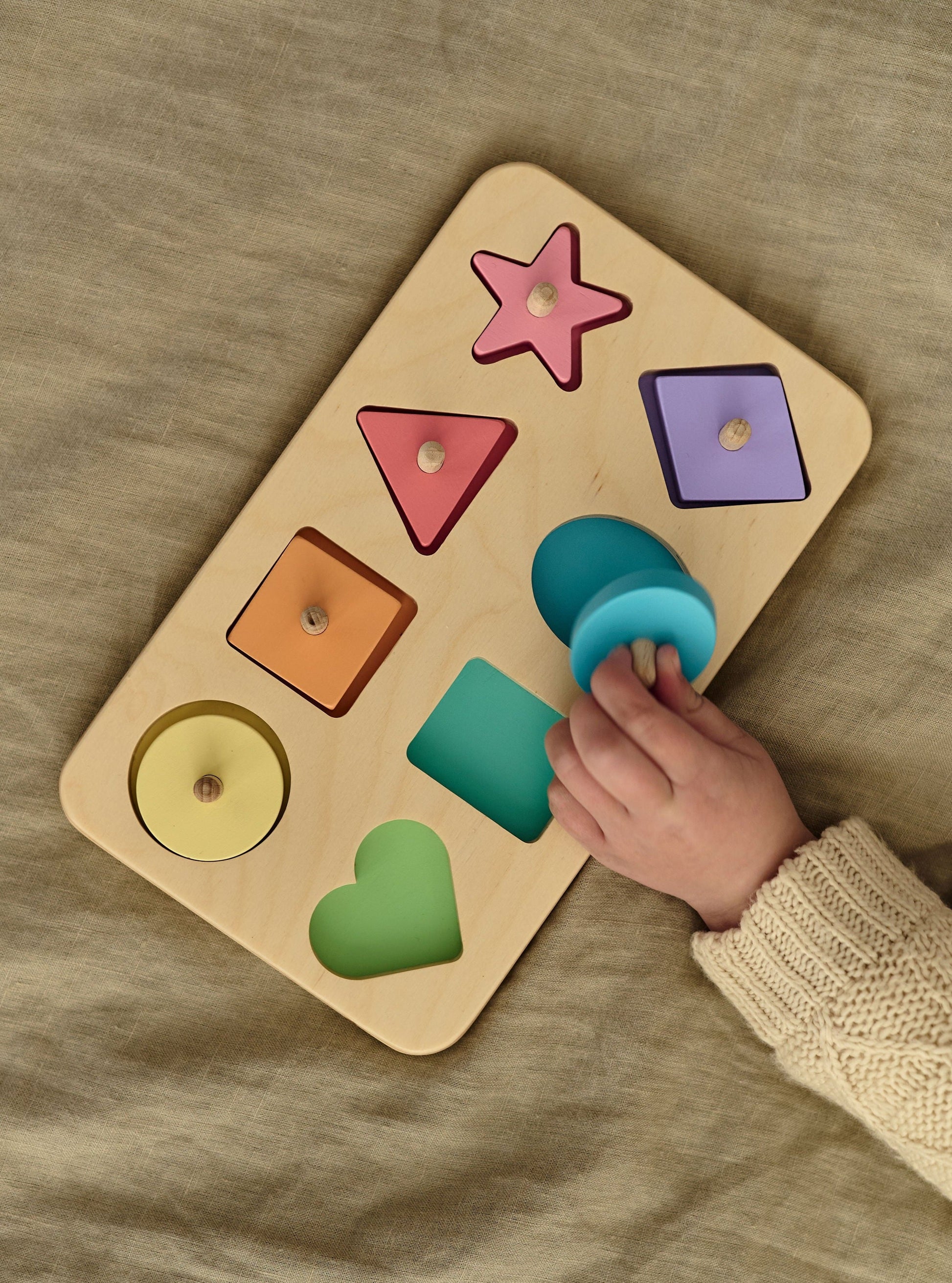 Ce trieur de formes en bois, orné de figures géométriques simples, est un jouet intéressant et élégant qui permettra à votre enfant d'apprendre à distinguer les couleurs et les formes. Il favorise également le développement de ses capacités d'analyse et de comparaison, car pour remplir les emplacements vides, il devra essayer différentes pièces et trouver la place idéale pour chacune.