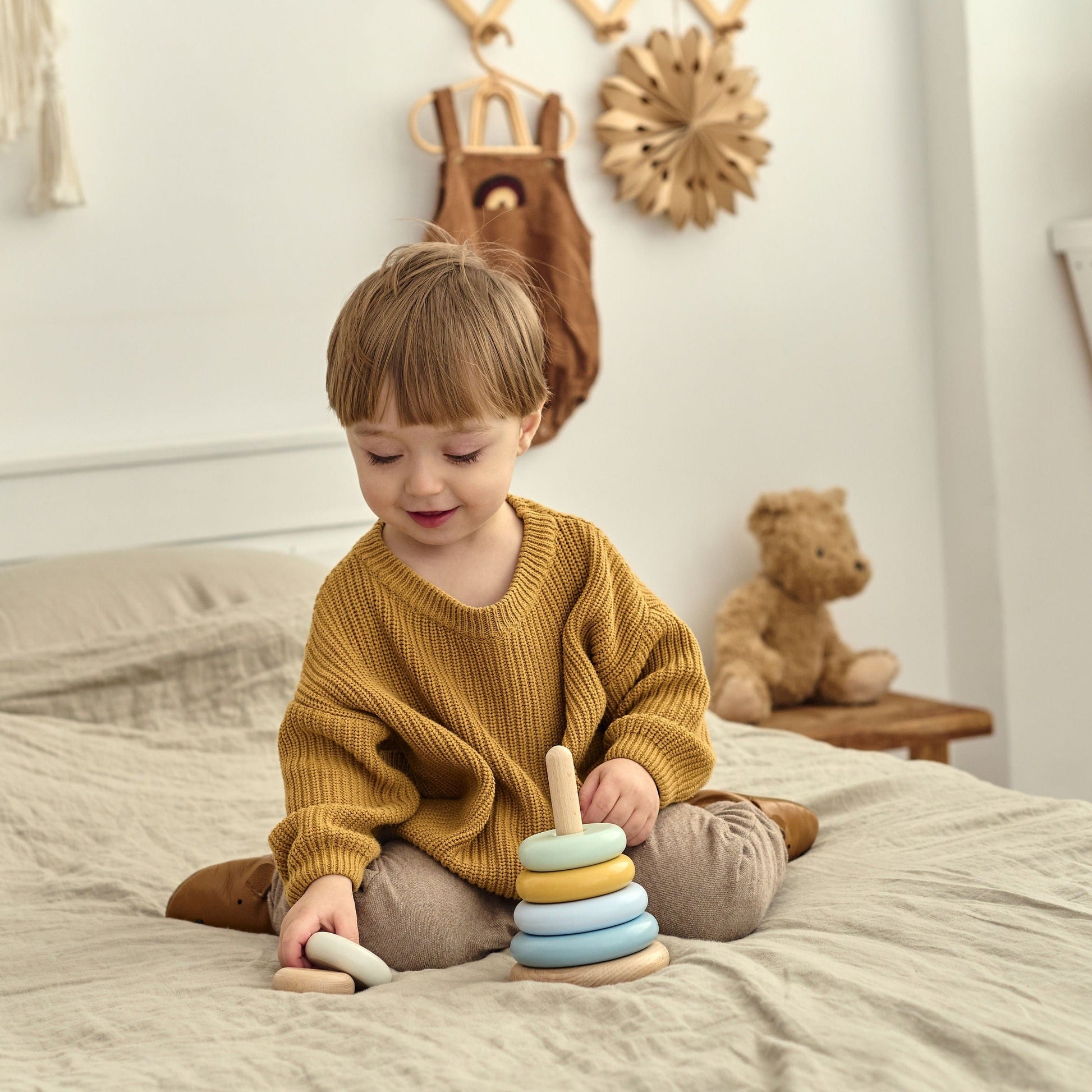 Apprendre en s'amusant avec notre magnifique jeu d'empilage en bois bleu ! Ce jeu d'anneaux en bois est conçu pour développer la coordination œil-main des enfants par le jeu.