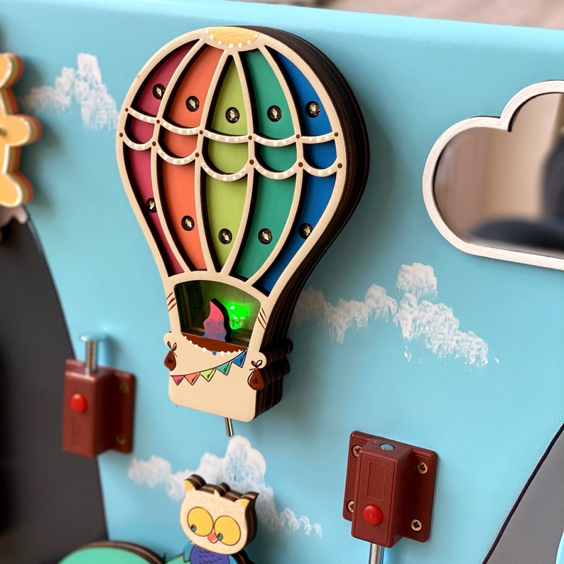 Ce tableau d'activités regorge de détails artistiques peints à la main et propose 25 éléments de jeu éducatifs complexes. On y trouve des engrenages multicolores, un xylophone, un miroir nuage, un robinet, un hérisson avec des boutons extensibles, deux portes à serrure dissimulant des animaux, des jetons, un ballon veilleuse, un sablier, un soleil tournant avec des perles, des cubes à histoires, un arbre à compter, un cercle avec des animaux cachés, des cubes puzzle avec des animaux amusants, un cylindre avec des perles en bois, des animaux à scratch et un nuage en tissu avec des ficelles et des perles. Ce tableau d'activités permet de gagner beaucoup de place par rapport à une boîte de jouets.