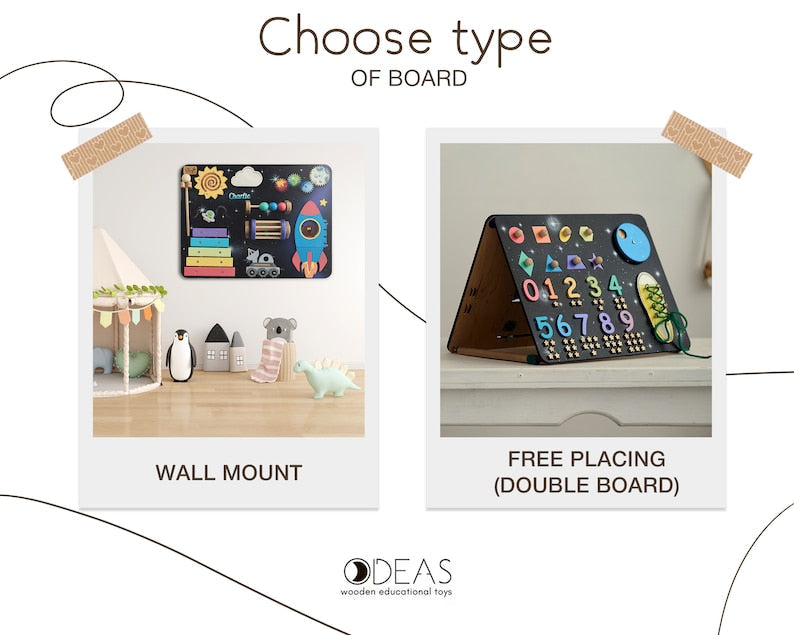 Pour de meilleurs résultats, vous pouvez commander un tableau d'activités double face qui comprendra davantage d'éléments ludiques, comme des animaux (pour une meilleure perception visuelle), un jeu de laçage (pour les sensations tactiles) et un trieur géométrique avec des chiffres pour apprendre à votre enfant à compter. Ce format compact est très pratique car il combine de nombreuses activités. De plus, ce tableau d'activités est facile à déplacer dans la maison et à transporter.