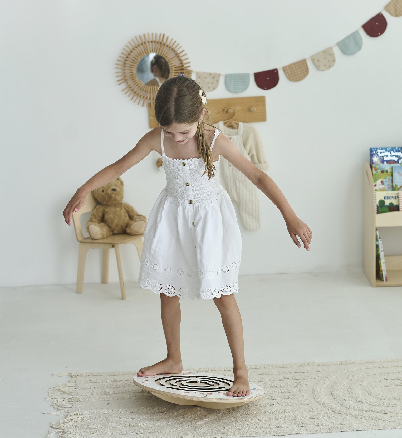 L'objectif principal de la planche d'équilibre est de développer le sens de l'équilibre et de renforcer les muscles des jambes et du dos. Les exercices d'équilibre stimulent activement le cervelet (une zone du cerveau située à l'arrière et en bas), responsable de la coordination des mouvements, des fonctions de l'appareil vestibulaire et connecté à l'ensemble du système nerveux. Il joue un rôle essentiel dans le développement intellectuel, langagier et émotionnel de l'enfant. L'exercice sur la planche d'équilibre est un excellent exercice physique : en essayant simplement de garder l'équilibre, votre enfant sera naturellement amené à se redresser et à contracter ses abdominaux, ses épaules et ses jambes.